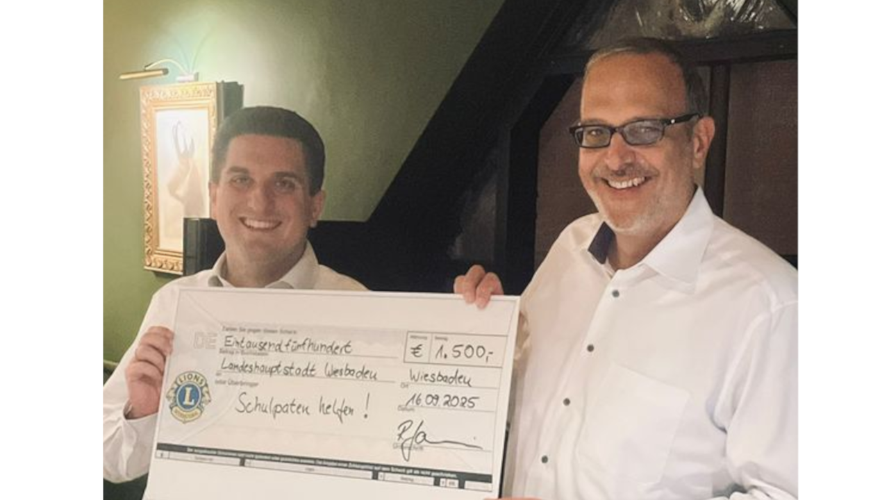 (rechts im Bild) einen Scheck über 1.500 EUR an den Wiesbadener Schuldezernenten Dr.